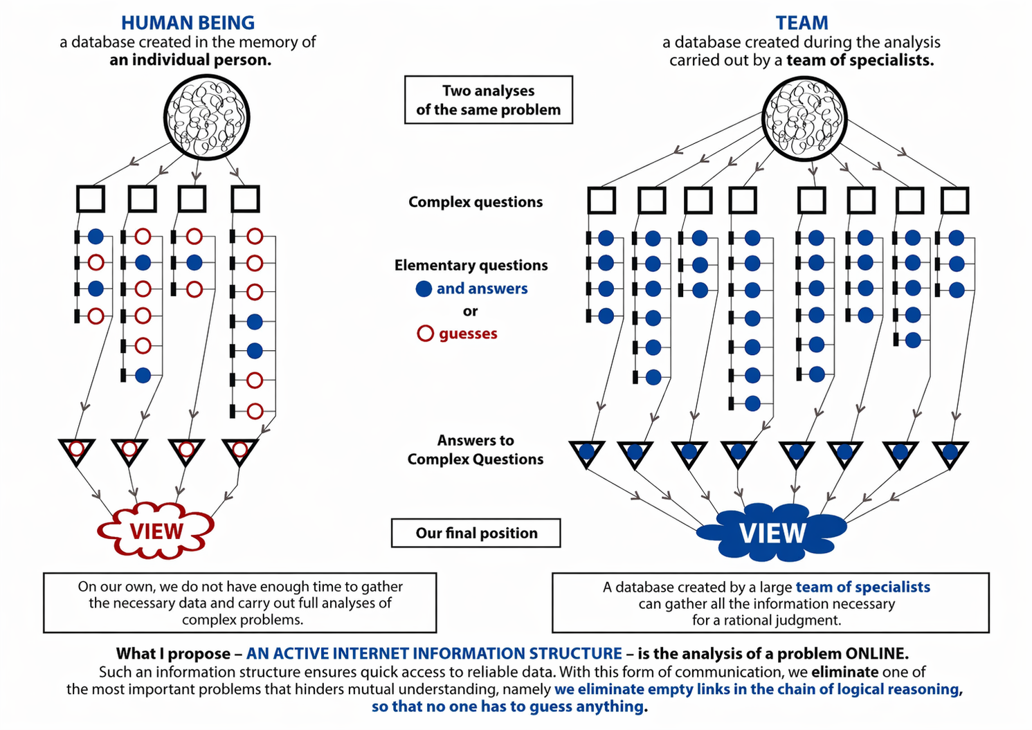 In broad simplification, one may say that there are significant differences between the databases stored in each person’s mind, caused by the work they do every day, their education, their place in society, and so on. On their own, hardly any individual will possess sufficient knowledge for a full analysis of a complex problem. Most of us will also see the problem only from one—our own—perspective. Yet each of us will want to prove, during a discussion, that “I am right.”